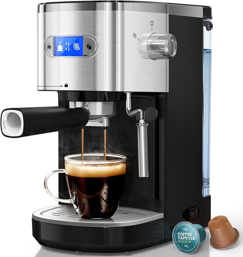 Sistema de presión profesional de 20 bares: máquina espresso semiautomática 2 en 1 equipada con una bomba profesional de 20 bar. Puede optar por poner café en polvo o café en cápsulas, y esta cafetera italiana puede proporcionarle una extracción de primera clase, haciendo que su aroma sea más intenso. Tomar una taza de café con un rico aroma en una tarde tranquila es realmente algo feliz.