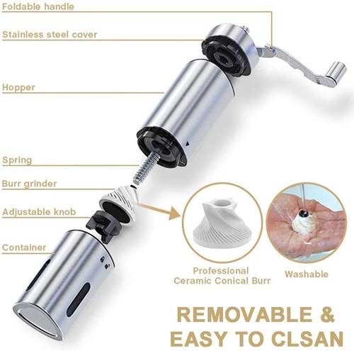 El molinillo de café está hecho de acero inoxidable de grado alimenticio, que es más duradero que la base de plástico o vidrio. Las rebabas de cerámica resistentes al desgaste garantizan una vida útil más larga.