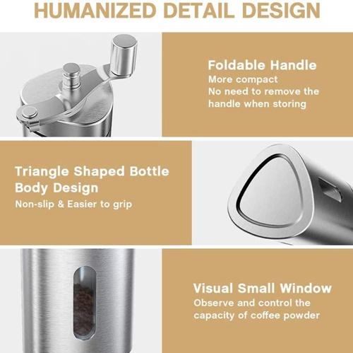 Molienda manual significa que no necesita pilas. El cuerpo de la botella triangular es más estable, fácil de agarrar y moler. Es más adecuado para cualquier tipo de métodos de elaboración, como prensado francés, preparación en frío, riego por goteo, vertedor de polvo, etc. También puede moler varios productos, como soja, baños de café, pimienta, zanthoxylum bungeaum, azúcar.